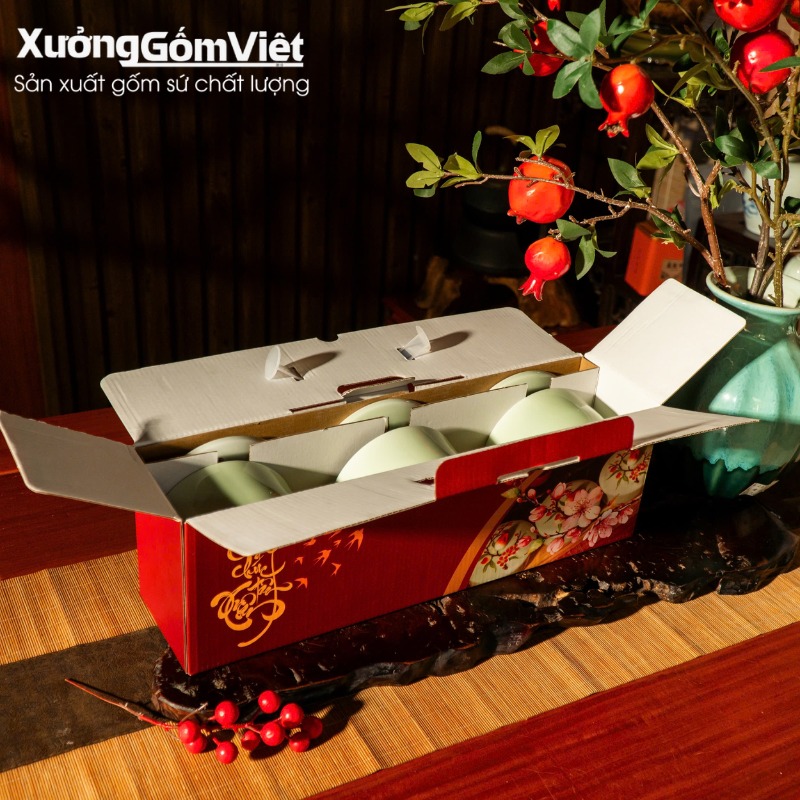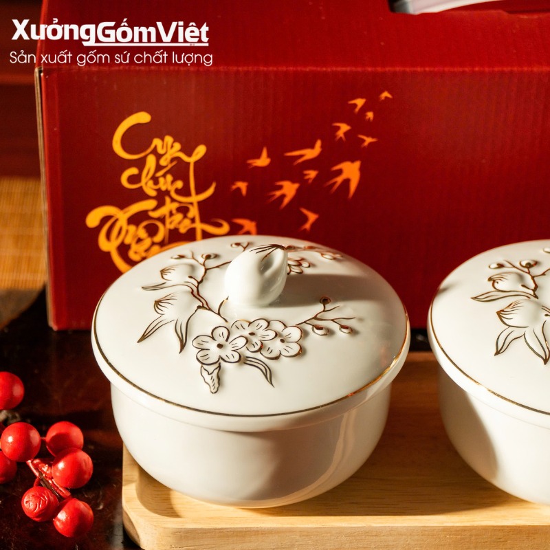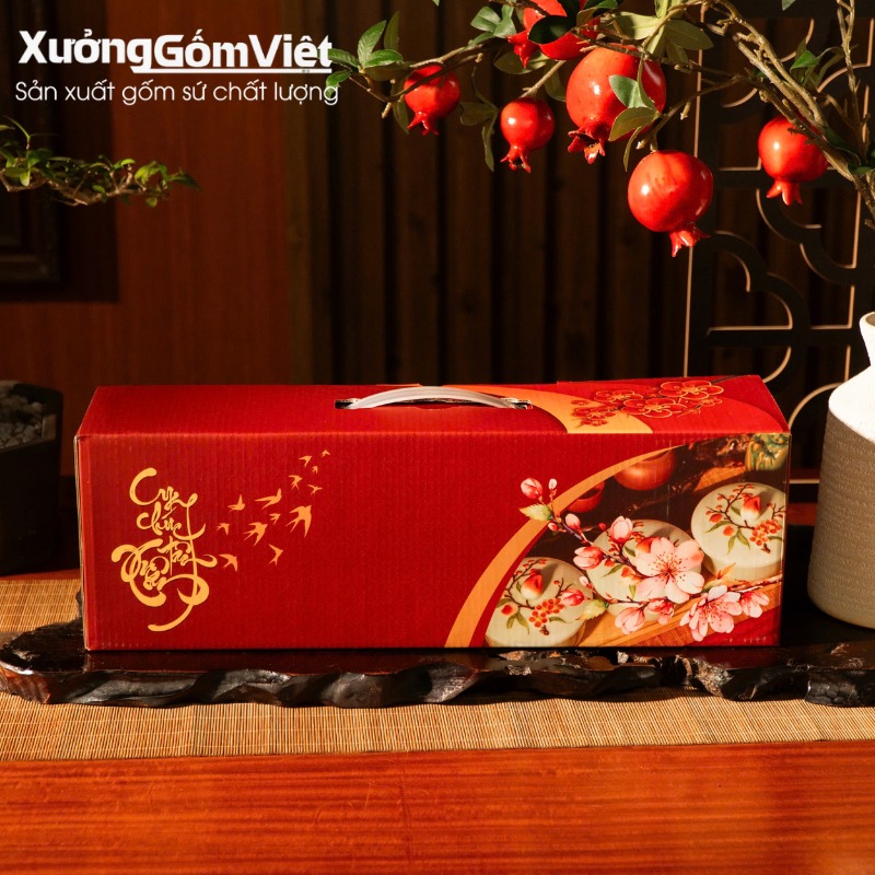 Bên cạnh đó, Xưởng Gốm Việt cung cấp dịch vụ thiết kế và sản xuất hộp đựng quà tặng cao cấp. Phổ biến nhất là hộp xi cứng lót lụa, được thiết kế khuôn xốp định hình vừa vặn với sản phẩm, giúp bảo vệ khay mứt an toàn trong quá trình vận chuyển. Hộp quà sang trọng cũng góp phần nâng cao giá trị của sản phẩm quà tặng khay mứt sứ, thể hiện sự chu đáo và chuyên nghiệp của doanh nghiệp.