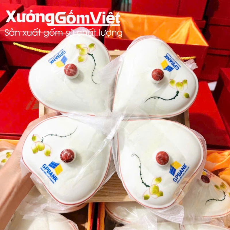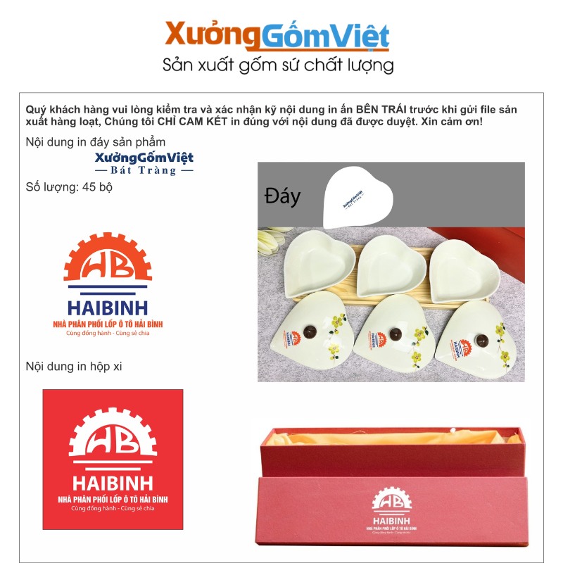 Khay mứt sứ quà tặng cho Nhà phân phối lốp ô tô Hải Bình: Đơn hàng bao gồm 45 bộ khay mứt sứ hình trái tim độc đáo, thể hiện sự gắn kết và tri ân. Logo của Nhà phân phối Hải Bình được in sắc nét trên từng cánh mứt và trên hộp quà tặng màu đỏ sang trọng, tạo nên một bộ quà tặng đồng bộ và chuyên nghiệp.