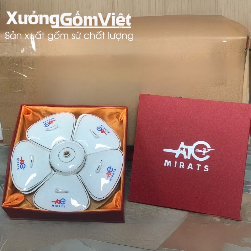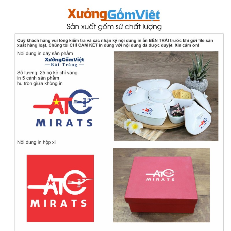 Bộ khay mứt sứ in logo cho ATC MIRATS: Xưởng Gốm Việt đã sản xuất 25 bộ khay mứt 5 cánh có kẻ chỉ vàng tinh tế cho công ty ATC MIRATS. Logo thương hiệu được in nổi bật trên nắp 5 cánh sản phẩm và hộp xi đỏ cao cấp, mang lại một giải pháp quà tặng đẳng cấp cho đối tác.