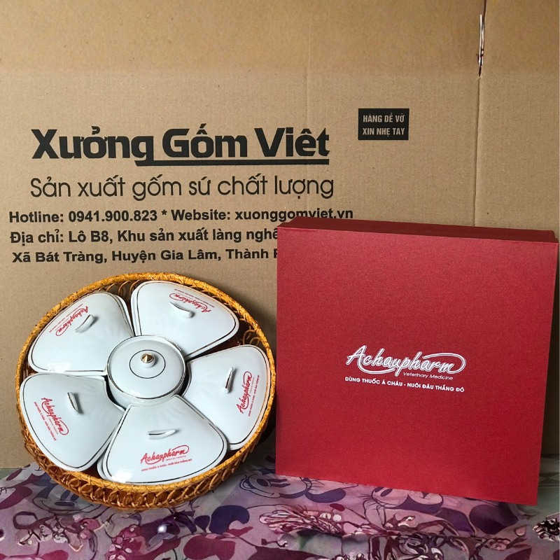 Bên cạnh đó, Xưởng Gốm Việt cung cấp dịch vụ thiết kế và sản xuất hộp đựng quà tặng cao cấp. Phổ biến nhất là hộp xi cứng lót lụa, được thiết kế khuôn xốp định hình vừa vặn với sản phẩm, giúp bảo vệ khay mứt an toàn trong quá trình vận chuyển. Hộp quà sang trọng cũng góp phần nâng cao giá trị của sản phẩm quà tặng khay mứt sứ, thể hiện sự chu đáo và chuyên nghiệp của doanh nghiệp.